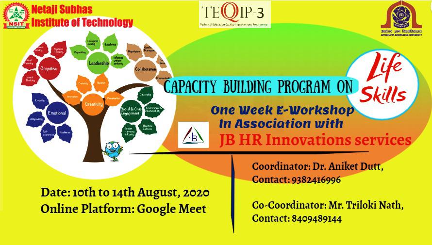 JB HR Innovations Services (JBHRIS) is happy to organize a one-week e-workshop on the Capacity Building Program on Life Skills with the Netaji Subhas Institute of Technology, Patna, under TEQIP-3. Life skills training equips students and faculty with the social and interpersonal skills that enable them to cope with the demands of everyday life. The objectives of this program are to build self-confidence, encourage critical thinking, foster independence, and help them to communicate more effectively.