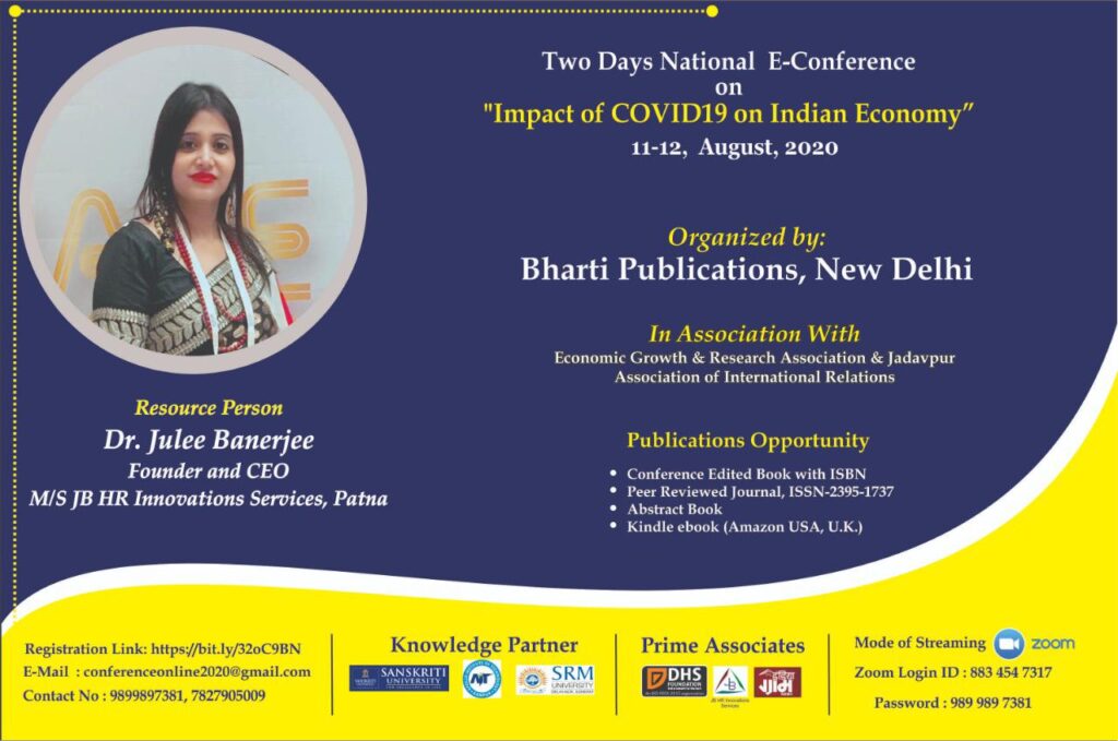 It is a proud moment to be invited as a Resource Person in the 2 Days National E- Conference on “ Impact of COVID-19 on Indian Economy” to be organized on 11-12 th August,2020 by Bharti.