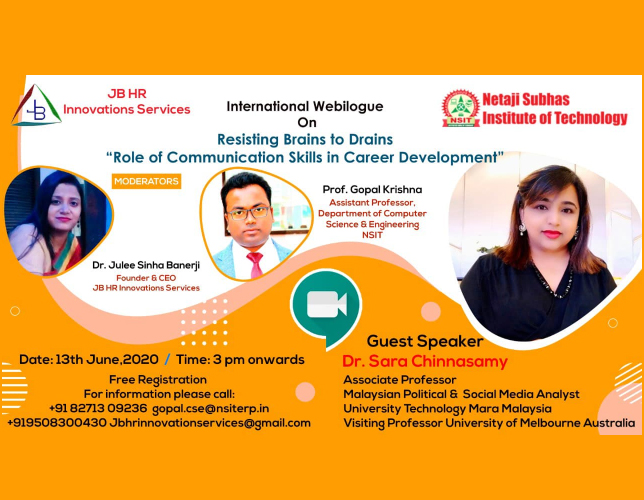JB HR Innovations Services(JBHRIS) in association with NSIT Patna has successfully organised an International Talk Show on “Resisting Brains to Drain- Role of Communication Skills in Career Development” on 13 th June,2020 delivered by Prof (Dr.) Sara Chinnasamy, a Political and Social Media Analyst from Malaysia and also a Visiting Professor at the University of Melbourne. The outcome of discussions were how Graduates will soon embark on their journey of entering the workforce, but with an unstable global economy and many looking for employment at the same time during the COVID-19 Pandemic, how one need to prepare while staying at home. This is not only about the question of role of communication but also ‘the question of self discovery’. To what extent one can know better. Though we are in the recovery period of COVID-19, a great time to get to know yourself better, work out what you enjoy, and think about what career you can see yourself taking forward after graduating. Self Behavioral Assessment is important to analyse the characteristics and personality, and it can lead us to the field to which one is most suited. The assessments are a great way of understanding what our values are, what we like, and what we don’t like. At least a behavioral assessment should match at least 70% of these values. Another most Important thing is to Understand the Market , once the student is clear on the career direction that they want to pursue. The next thing is to conduct research of what jobs are available, and what are the demands. Need of the hour is to read the job descriptions carefully to find out what skill sets are required for that specific job. Then look into the ways that one can develop and hone these skills, so you can speak about them confidently in interviews. The participants were from different parts of India like IIMT University, Mangalmay Institute of Management & Technology, L&T, NSIT, GNSU, PWC, IGIMS, IGNOU,ICFAI and many more. I sincerely thank everyone for your wonderful participation.