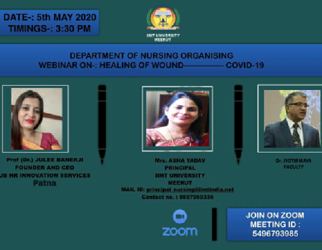 Dr. Julee Banerji invited by IIMT University, Meerut for the discussion on ‘Healing of Wounds’-Post . It was a great moment addressing the Department of Nursing at IIMT University, Meerut. Mainly focussed on Mental and Emotional Wounds, Spiritual Wounds, Physical Wounds, Financial Wounds , Significance of Nurses as a mother, daughter and sister, Managing and Healing Wounds during COVID-19.