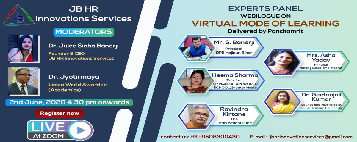 With the discussion held in PART 1 of Webilogue on “ Virtual Mode of Learning” by SAPTARISHIS held on 17/5/2020, it was unanimously consented that Virtual Learning, Training & Education is the order of the day. It was opined sooner the academia get wedded to the new concept, the better it would be for the process of transmission and transformation of Knowledge Quotient. Apt for the higher platform there is a felt need to examine the concept in the area of SCHOOL EDUCATION. Here the ambassadors of PANCHAMRIT would be doing “GYAN MANTHAN” and “GYAN CHINTAN” for drawing relevant relevances. OVER TO PANCHAMRIT DHARIS 🎤 JB HR Innovations Services(JBHRIS) is coming with another round of discussion on “Virtual Mode of Learning* – Part 2 scheduled on 2nd June,2020* delivered by eminent academicians chosen from different regions of India.