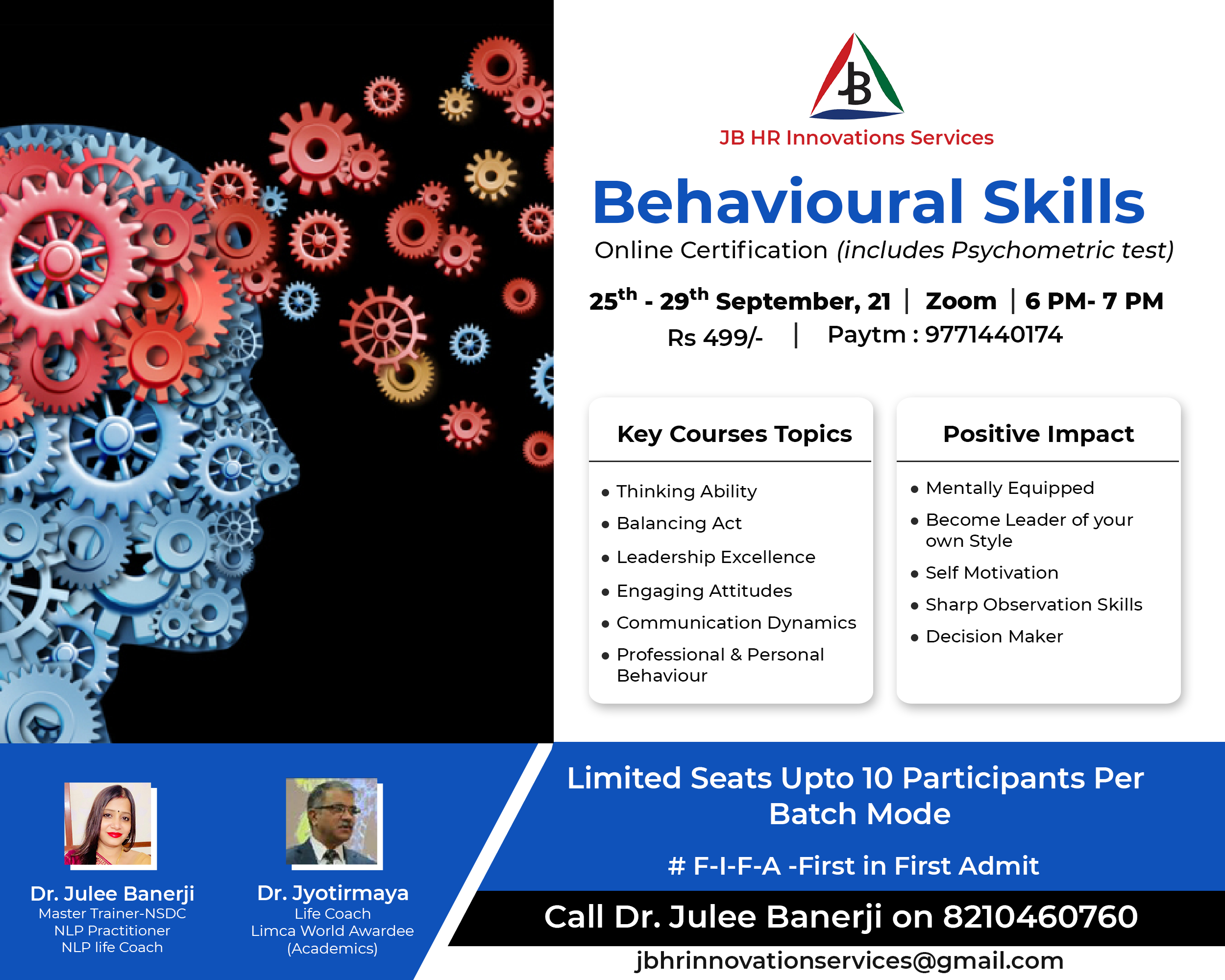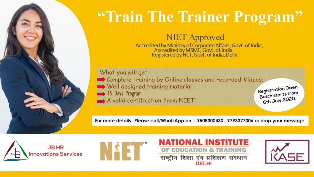 JBHRIS is happy to offer ‘Train The Trainer Program’ approved by National Institute of Education & Training(NIET) to all those professionals and new trainers who want to excel in their chosen areas. It is also well suited for those who are already working and would like to take certification for further career progression. Become certified as a trainer, strengthen your profile and enhance your professional life by consistently improving and learning new skills. In our program we will be training you with 25 Soft Skills. Well designed training material with recorded sessions and PPT’s will be given. Those who are looking to excel in Training, Learning and Development, Coaching and Mentoring departments of various companies and want to improve their skill set to make their CV stronger and existing employees looking for a better role can join this certification.