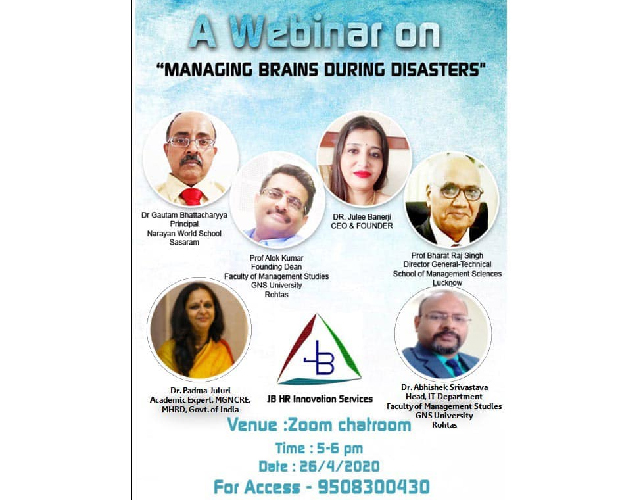 M/s JB HR Innovation Services(JBHRIS) has begun to take off with your good wishes and blessings. It’s a dream project for and we wish to contribute the society in terms of Training, Consulting and Recruiting. JBHIS is happy to conduct it’s first Webinar on “Managing Brains During Disaster”, dated: 26/4/2020 at 5-6 PM. Managing Brains During Disaster The undebatable unique evolution of planet earth has definitely been the existence of human being through a series of natural experimentation. Corollarly to this; unique and non-congruent natural invention of human body has been the brain. Brain is the only organ in the animal (Faunal) Kingdom which is unique to each person. It can neither be replicated nor can be duplicated. This brain is a storehouse of anticipation, expectation, forecast, illusion, feelings, intuition, gut and the like. With the advent of media where disaster are foretold in space and time, in magnitude intensity, the brain starts extrapolating and interpolating like What will happen, When will it happen, How it will happen, Where will it happen, Who all will be affected and For whom it is destined are the natural questions emerging in the brain. The brain readies itself for all questions and answers in its conscious and sub conscious state. This enables human being to either take proactive or reactive measures. In this world of disasters where Management in concrete terms is the ‘Key’, the brain has to be so conditioned that whether it will be individual, or group or an organisation, so as to manage the impeding disaster. Soon is the case with the present scenario (COVID-19). Analysis reveals that ‘Had the problem been detected earlier Proactive measures could have been taken but now reactive measures are being adopted’. In this Webinar, the philosophy is to dwell on the psychological perspective of the “Disaster Management’ and its aftermath with reference to VUCA being the bedrock of all disaster: Corporate and Natural Phenomenon included.